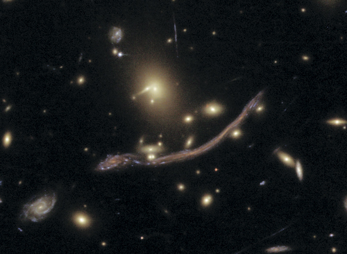 Длинная оранжево-голубая полоса на этом изображении скопления галактик Abell 370 – искаженное изображение далекой галактики, которая гравитационно линзируется массивным скоплением на переднем плане (другие линзовые объекты также рассматриваются как линейные объекты вокруг ярких эллиптических галактик). Форма линзированного изображения определяется распределением вещества в кластере – как «нормальной», так и темной материи. Увеличение яркости и растяжение изображения далекой галактики скоплением на переднем плане позволяют нам исследовать свойства этой галактики гораздо более детально, чем это было бы возможно без эффекта линзирования