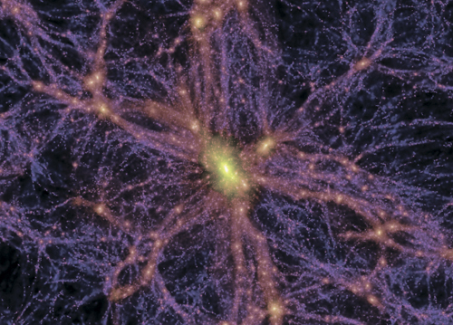 На изображении из проекта «Моделирование “Милленниум”» представлена одна из симуляций поведения холодного темного вещества с очень большим числом частиц. Учитывая космологическую модель, моделирование отслеживает эволюцию темной материи с самого начала. Здесь показано современное выделение темной материи вокруг массивного гало (скопления галактик): видимость – почти 100 млн пк, типичный кусок Вселенной, где более яркие цвета соответствуют более высокой плотности темной материи. Галактики внутри таких гало с центральной массивной структурой могут содержать много отдельных систем (отличный пример – скопление Кома). Хорошо видны распределение материи в космической сети и иерархическая структура. Наша текущая модель возникновения галактик предполагает, что галактики формируются в результате охлаждения первоначального газа в гало темной материи и последующего образования звезд. Формирование галактики – очень сложный комплексный процесс, в котором задействована сложная физика; понимание затрудняет и то, что мы все еще не понимаем истинную природу самой темной материи