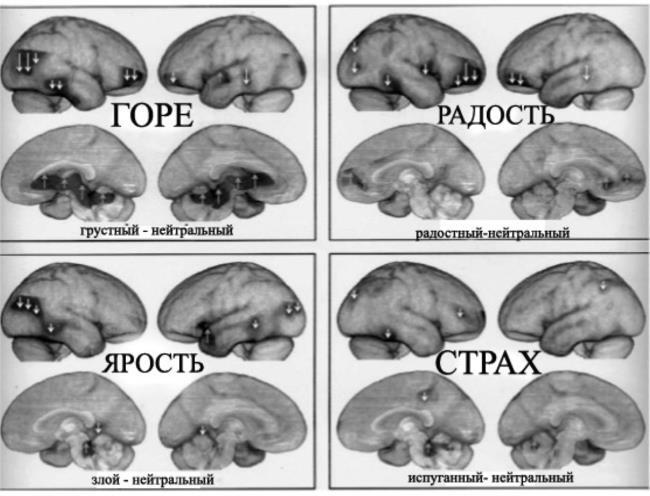 Области мозга, которые активируются при эмоциональных состояниях ПАНИКА/ГОРЕ, РАДОСТЬ/ИГРА, ЯРОСТЬ и СТРАХ, обозначены стрелками, направленными вверх. Области мозга, которые подавляются, обозначены стрелками, направленными вниз