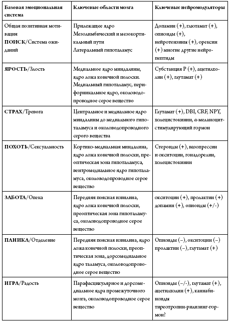 Как видно из приведенной выше таблицы, учение о базовых эмоциональных системах не является теоретическим. Панксеппом отображены соответствующие им области мозга и нейромодуляторы.