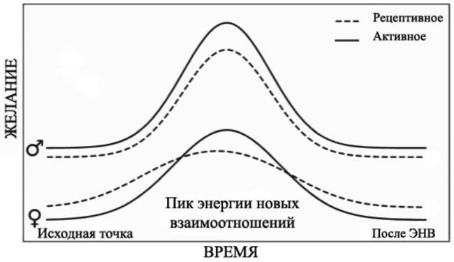 Такая изменчивость – движение от эмоциональной и сексуальной исходной точки до высшей точки ЭНВ, а затем обратно к исходной – неизбежна, она формирует вашу кривую желания. На графике, представленном ниже, показаны кривая желаний с исходной точкой и пиком ЭНВ, а также различия между мужчинами и женщинами в отношении спонтанного/активного желания и рецептивного/пассивного желания.
