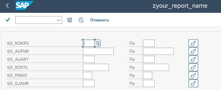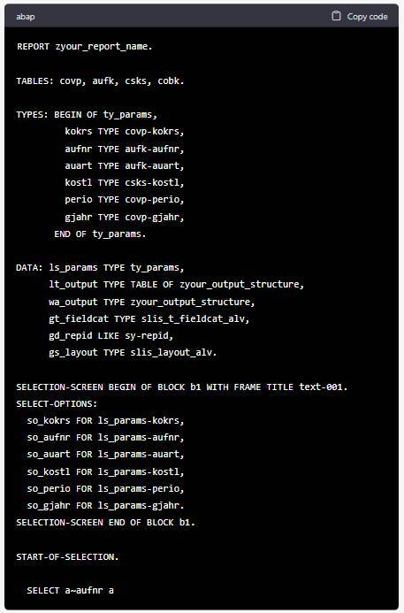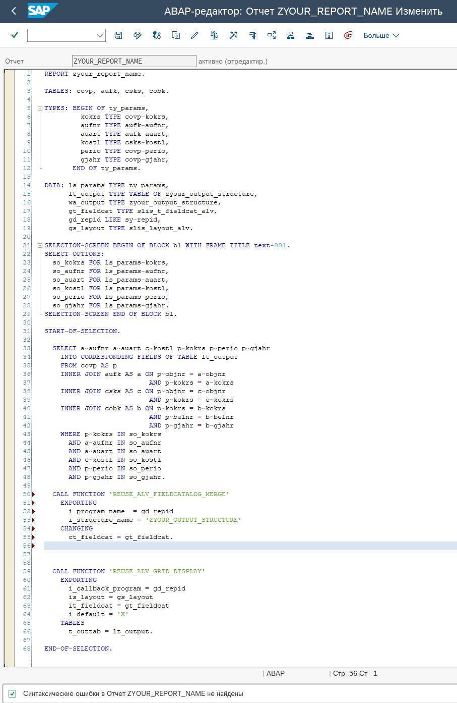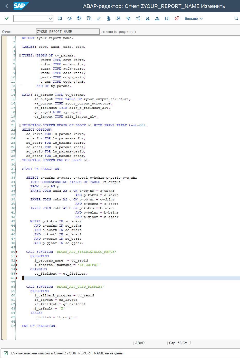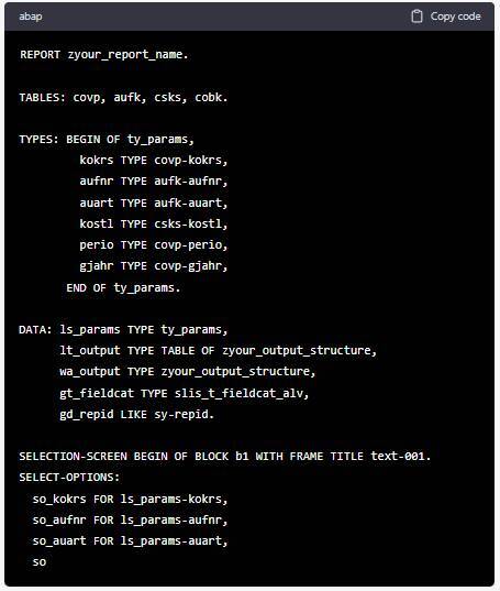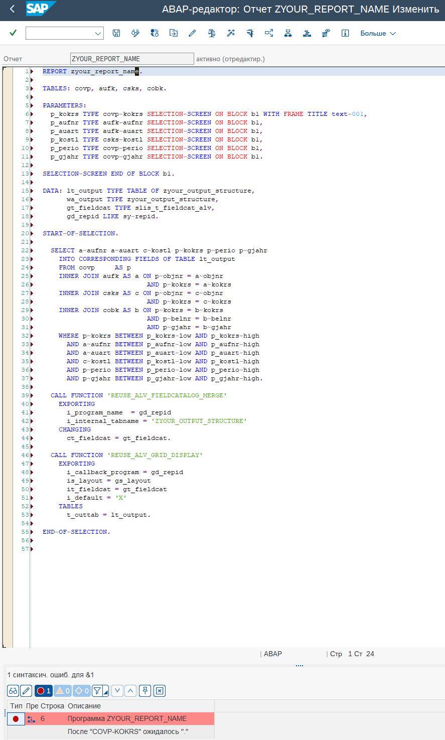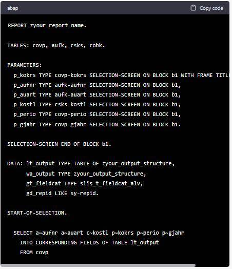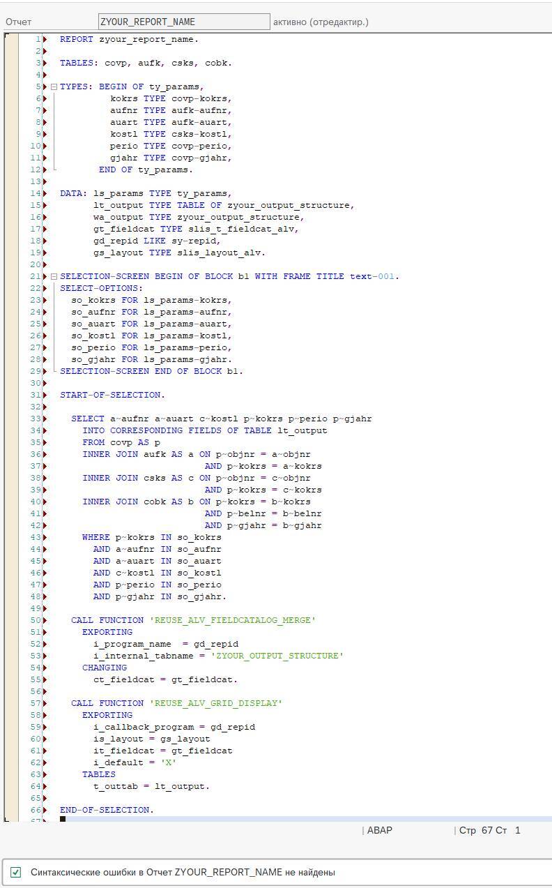 Дано следующие таблицы COVP-OBJNR = AUFK-OBJNR Covp-KOKRS=aufk-KOKRS COVP-OBJNR = CSKS-OBJNR COVP-KOKRS = CSKS-KOKRS COBK-KOKRS = COVP-KOKRS COBK-BELNR = COVP-BELNR COBK-GJAHR = COVP-GJAHR На селекционный экран выведи следующие переменные с возможностью выбора диапазона значений KOKRS AUFNR AUART KOSTL PERIO GJAHR Отчет представить в формате Alv gride. Код оптимизируй под SAP ERP NETWEAVER 7.4