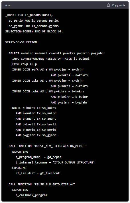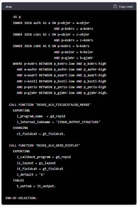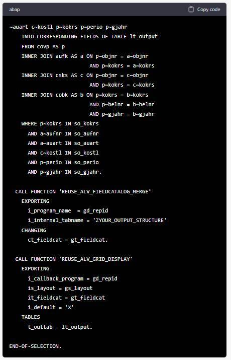 Для выполнения этого задания сначала создадим выборочный экран (selection screen) с указанными параметрами. Затем используем JOIN для объединения таблиц COVP, AUFK и CSKS, а затем используем функциональный модуль для вывода ALV Grid. Вот пример кода в ABAP:
