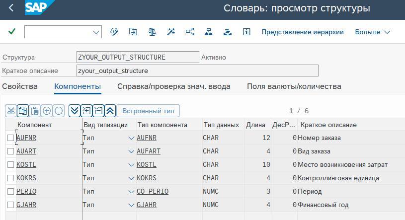 Чтобы создать структуру zyour_output_structure в Data Dictionary (SE11), выполните следующие шаги: