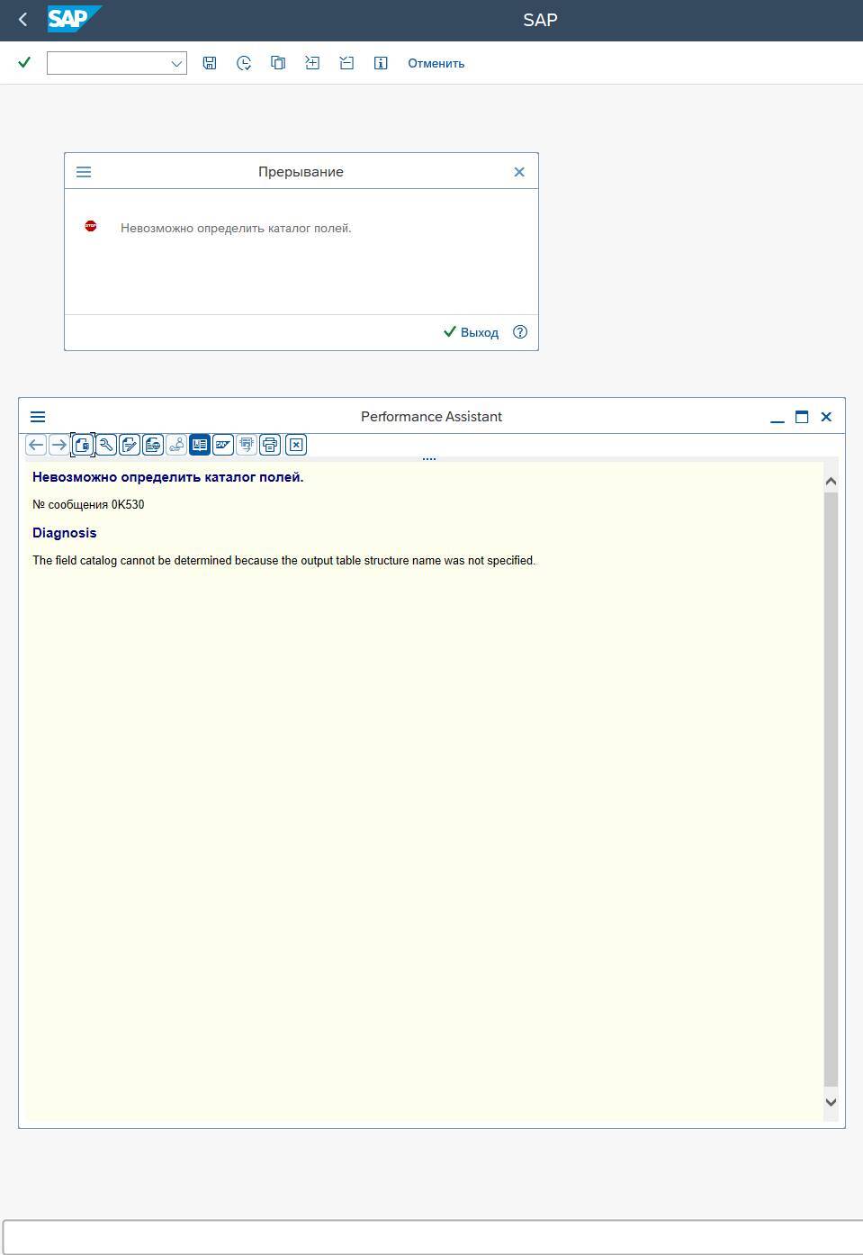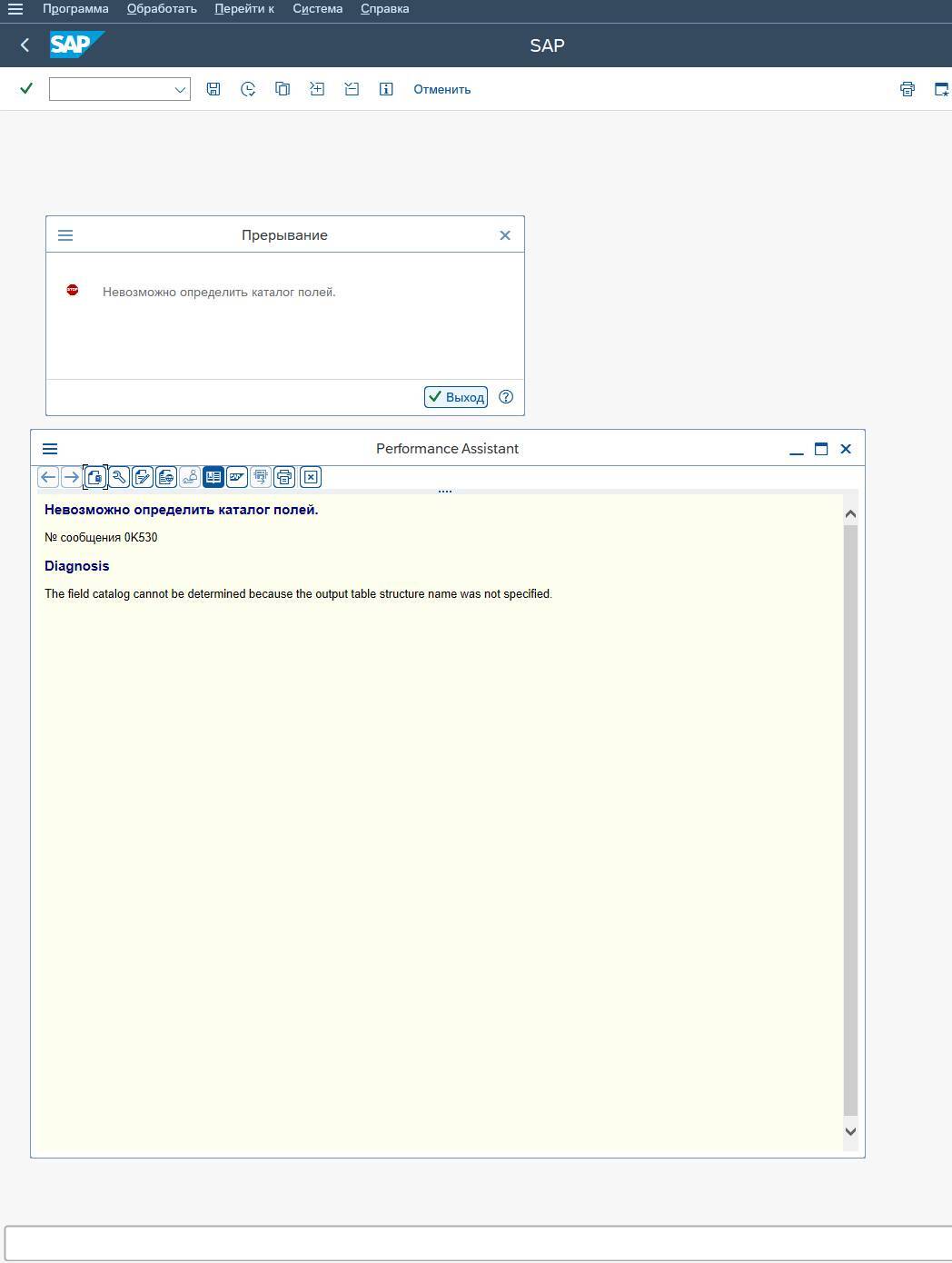 Ошибку не исправили таже ошибка – Невозможно определить каталог полей. № сообщения 0K530 Diagnosis The field catalog cannot be determined because the output table structure name was not specified.