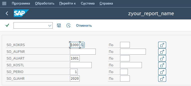 Переходим к следующему шагу – запуску отчета. Не забываем заполнить данные на селекционном экране произвольными значениями, чтобы ограничить выборку. Дампы и ошибки не появились на предыдущем этапе.