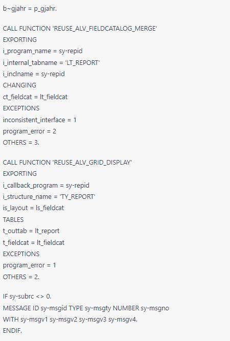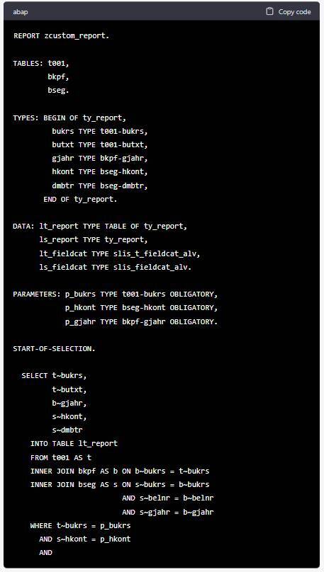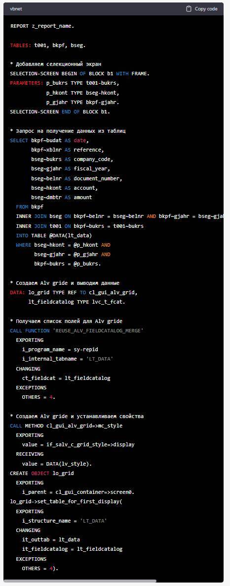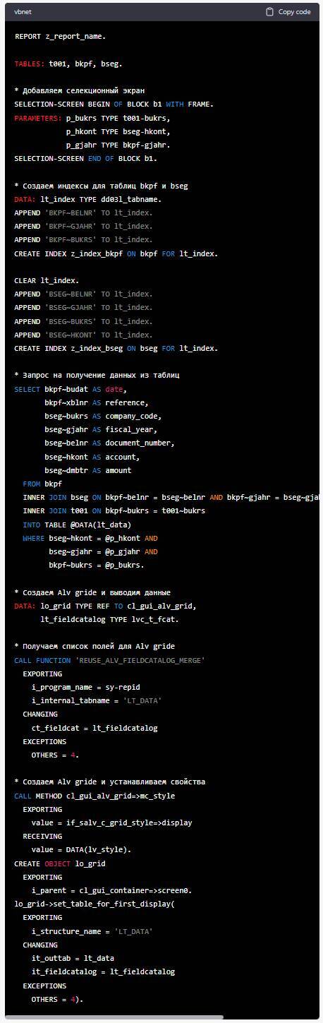 Теперь код структурирован и легко читаем. Этот отчет использует данные из трех таблиц (T001, BKPF и BSEG) с использованием INNER JOIN для оптимизации работы с большим объемом данных. Затем он вызывает функцию 'REUSE_ALV_FIELDCATALOG_MERGE' для создания каталога полей ALV и функцию 'REUSE_ALV_GRID_DISPLAY' для отображения результатов в виде ALV Grid.