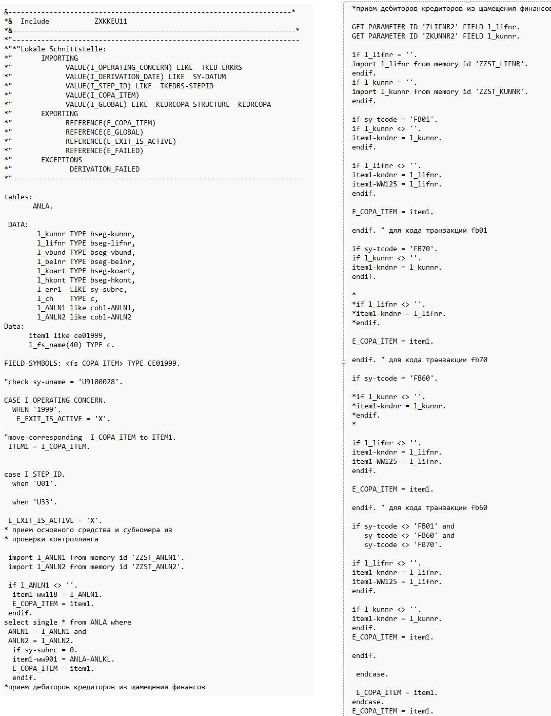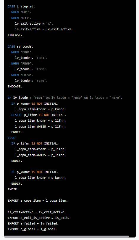 В блоке кода, использующем оператор IF, проверяется, установлено ли значение переменных p_kunnr и p_lifnr, переданных из внешнего источника. В случае, если значение p_kunnr или p_lifnr не пустое, устанавливаются соответствующие элементы структуры COPA (l_copa_item-kndnr и l_copa_item-WW125).