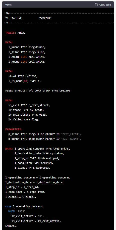 Первый блок кода является заголовочным, в котором указывается имя включаемого файла и описание локальных параметров. В данном случае, процедура принимает несколько параметров входа (I_OPERATING_CONCERN, I_DERIVATION_DATE, I_STEP_ID, I_COPA_ITEM, I_GLOBAL) и выхода (E_COPA_ITEM, E_GLOBAL, E_EXIT_IS_ACTIVE, E_FAILED), а также имеет локальные переменные.