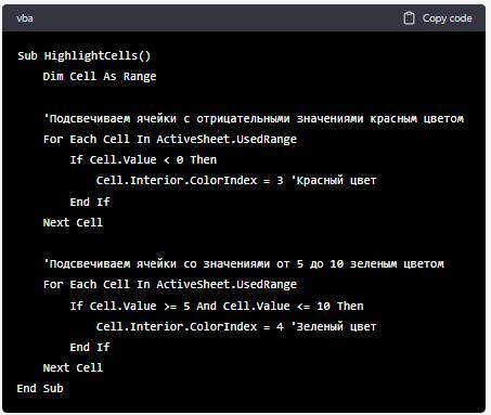 Конечно, вот пример макроса на VBA для Excel, который будет подсвечивать ячейки с отрицательными значениями красным цветом, а ячейки со значениями от 5 до 10 зеленым цветом: