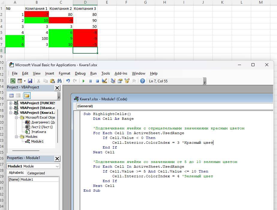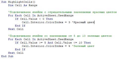 Таким образом, макрос HighlightCells перебирает все ячейки в диапазоне данных на активном листе Excel, и подсвечивает ячейки с отрицательными значениями красным цветом, а ячейки со значениями от 5 до 10 зеленым цветом.