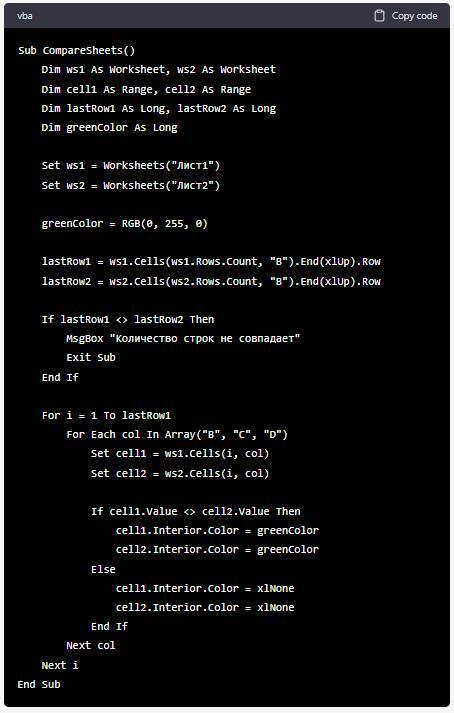 Sub CompareSheets() Dim ws1 As Worksheet, ws2 As Worksheet Dim cell1 As Range, cell2 As Range Dim lastRow1 As Long, lastRow2 As Long Dim greenColor As Long Set ws1 = Worksheets("Лист1") Set ws2 = Worksheets("Лист2") greenColor = RGB(0, 255, 0) lastRow1 = ws1.Cells(ws1.Rows.Count, "B").End(xlUp).Row lastRow2 = ws2.Cells(ws2.Rows.Count, "B").End(xlUp).Row If lastRow1 <> lastRow2 Then MsgBox "Количество строк не совпадает" Exit Sub End If For i = 1 To lastRow1 For Each col In Array("B", "C", "D") Set cell1 = ws1.Cells(i, col) Set cell2 = ws2.Cells(i, col) If cell1.Value <> cell2.Value Then cell1.Interior.Color = greenColor cell2.Interior.Color = greenColor Else cell1.Interior.Color = xlNone cell2.Interior.Color = xlNone End If Next col Next i End Sub