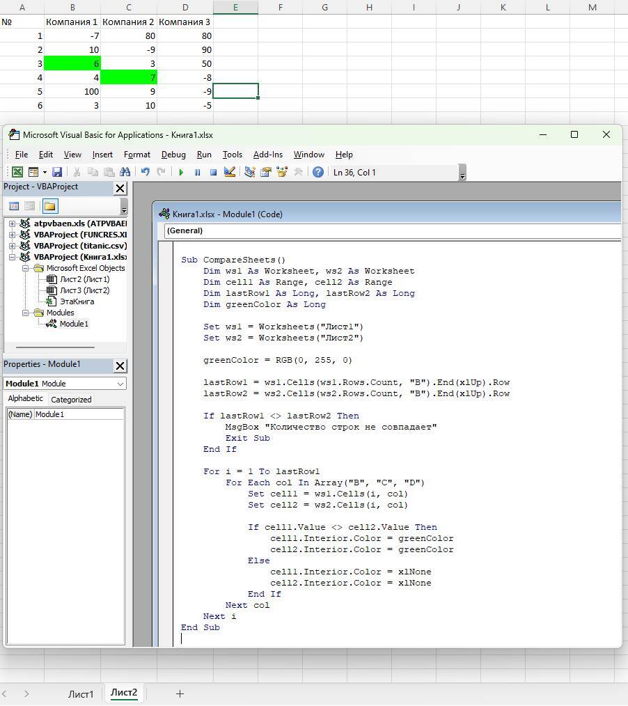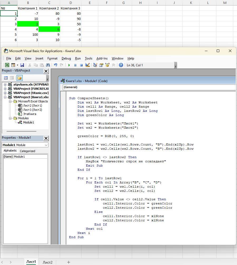 Данный макрос выполняет сравнение значений столбцов B, C и D между двумя листами – "Лист1" и "Лист2". Если значения ячеек в этих столбцах не совпадают, макрос подсвечивает ячейки зеленым цветом на обоих листах. Если количество строк в столбцах на обоих листах не совпадает, макрос выведет сообщение "Количество строк не совпадает" и завершит свою работу.
