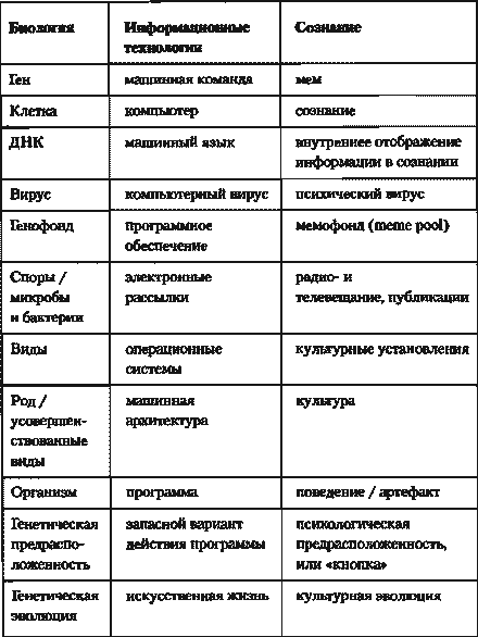 Вирусы существуют в трех не связанных друг с другом сферах: в биологии, в мире информационных технологий и в человеческом сознании. В данной таблице сопоставлены различные термины, используемые в описании эволюции и вирусов каждого из трех названных «миров».