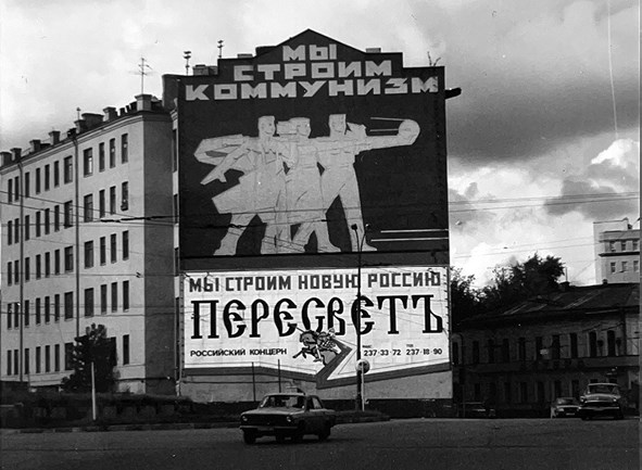 Вместе с тем начиная с девяностых имперское ретро в России явно функционировало не только в регистре приятной постисторической нормальности. Возьмем, например, рекламу торгового дома «Пересвет» 1993 года. С одной стороны, сам рекламный щит «Пересвета» апеллирует к знакомой досоветской эстетике. Но реклама обретает значение в контрасте с другой, тоже своего рода рекламой – лозунгом: «Мы строим коммунизм!», выдержанным в конструктивистском стиле и помещенным на торец здания на Серпуховской (бывшей Добрынинской) площади в 1970-е или 1980-е годы. Примечательно, что «Пересвет» предпочел не закрыть прежний лозунг, а разместить прямо под ним свой вызывающий ответ: «Мы строим новую Россию!» Зачем вешать такой ответ, вместо того чтобы просто избавиться от старого лозунга? И почему именно «Пересвет» разместил такой плакат? Этот ответ обретает смысл в конкретный исторический момент – в 1993 году, когда произошел конституционный кризис, который Ельцин в конечном счете разрешил с помощью вооруженной осады парламента, отстранившего его от должности; свои действия Ельцин обосновал тем, что его политические противники – «красно-коричневые» реваншисты, мечтающие вернуть страшные сталинские времена. Реклама «Пересвета», выполненная в духе имперского ретро, намекает на эту конфронтацию, споря с советским наследием. Капиталистическая «новая Россия», которую строит «Пересвет», противостоит бессмысленному, утопическому отклонению от правильного пути – «строительству коммунизма». Бизнес здесь предстает как менее утопическая, а потому более нравственная, более достойная задача.