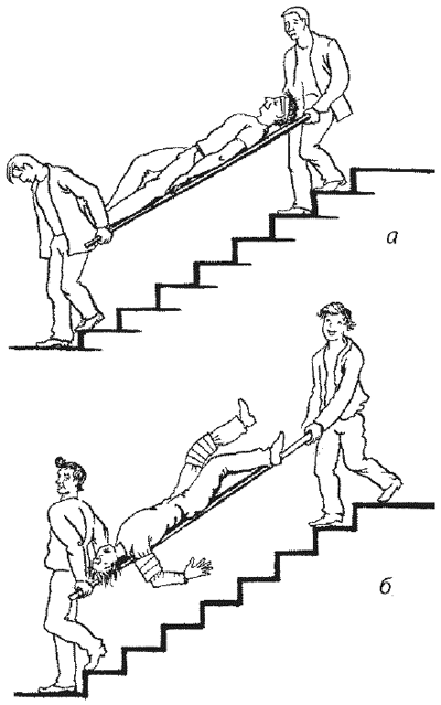 Как спускаться с носилками по лестнице: а – правильно; б – неправильно.