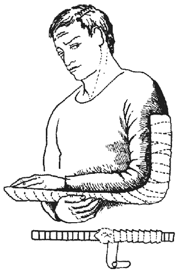 Обратите внимание, что кисть лежит на повязке, а не свисает с нее. Устойчивое положение локтя обеспечивается загнутым углом косынки. В подмышечную впадину вкладывается ватно-марлевый валик или его импровизированная замена.
