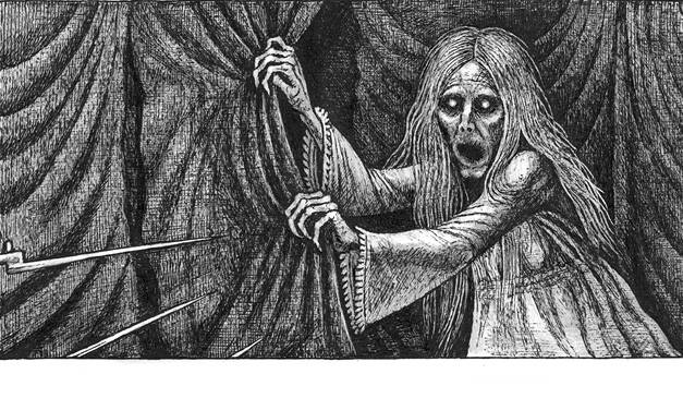 Затем оно, едва держась на трясущихся ногах, поднялось по ступеням катафалка, ухватилось за край гроба и, обвив своими скелетными руками плечи покойника, зарыдало…