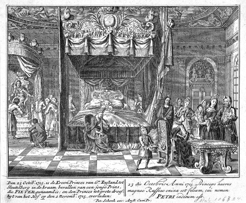 Петер Шенк. Сцена рождения царевича Петра II. Гравюра. 1715 г.