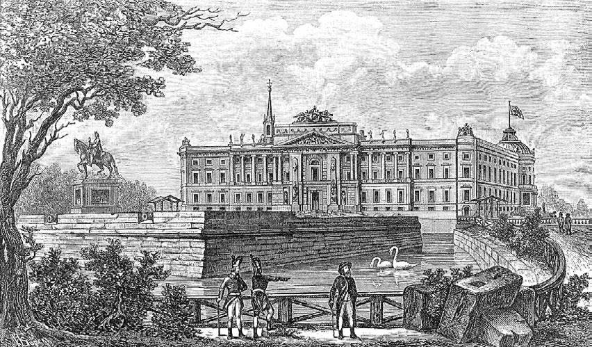 Август Даугель. Вид Михайловского замка в 1800–1801 годах. Гравюра. 1883 г.