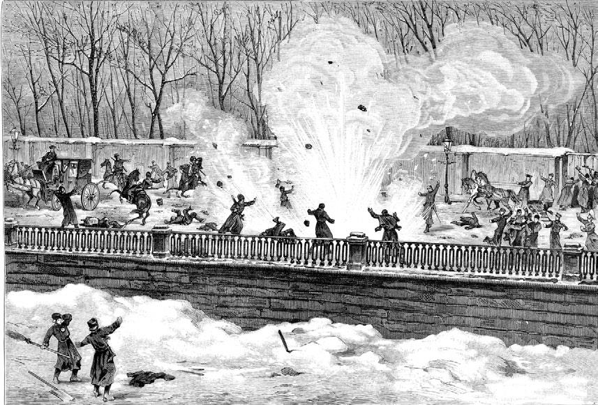 Когда царский экипаж с эскортом следовал по набережной, народоволец Рысаков бросил под карету бомбу. Взрыв произошел под задними колесами, и весь царский поезд сразу остановился.