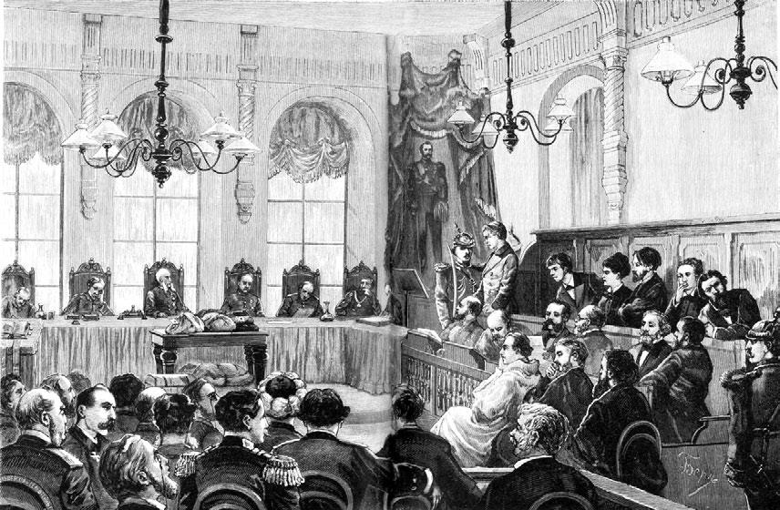 Заседание особого присутствия Правительствующего Сената по делу о злодеянии 1 марта. 1881 г. Иллюстрация из русского еженедельного журнала «Нива»