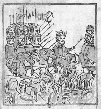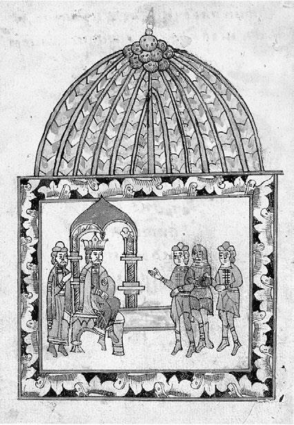 Сказание о Мамаевом побоище. Разведчики, посланные князем Дмитрием Ивановичем, привели к нему пленного «языка», подтвердившего известие о походе Мамая на Русь. Миниатюра из «Лицевой рукописи». XVII в. Государственный исторический музей, Москва