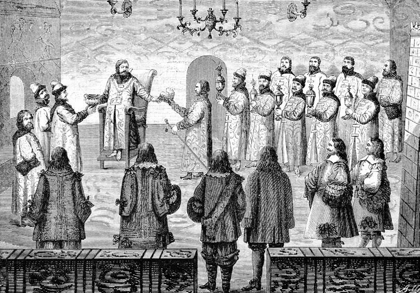 Царь Алексей Михайлович встречается с послами. 1888 г. Гравюра из русского еженедельного журнала «Нива»