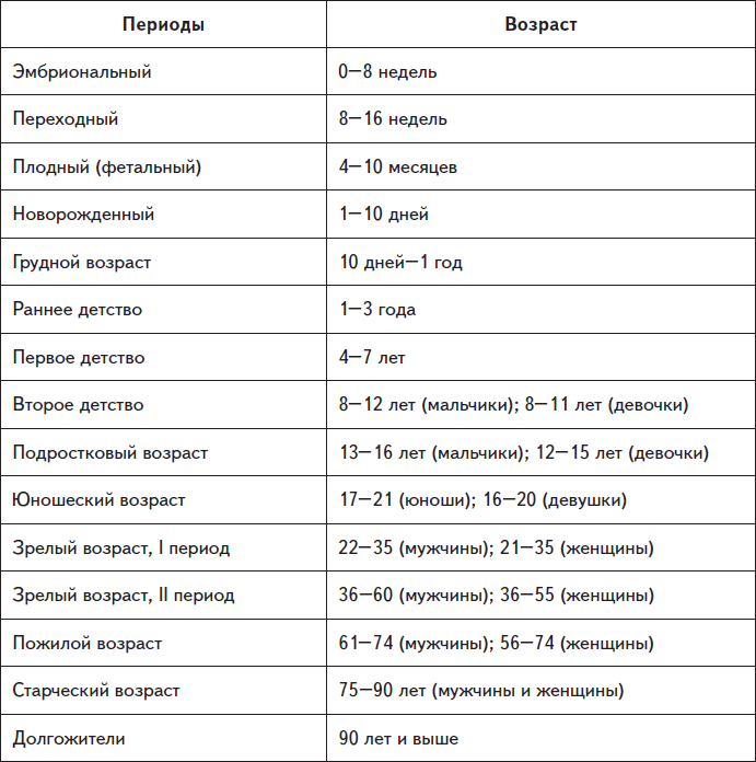 Приводим общепринятую в настоящее время периодизацию второго (внеутробного) периода жизни человека (табл. 3).