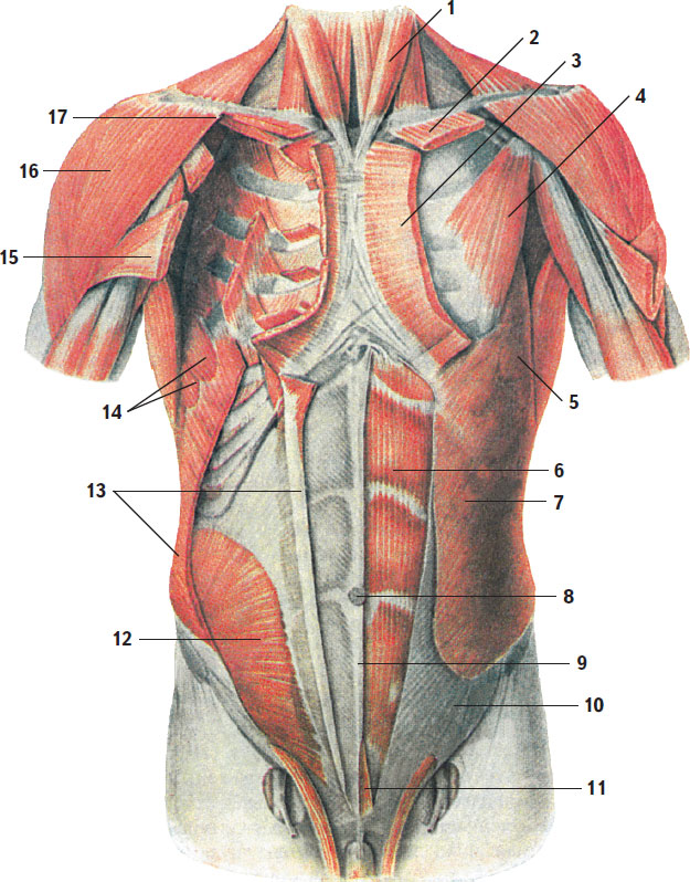 1 – грудино-ключично-сосцевидная мышца; 2 – трапециевидная мышца; 3 – большая грудная мышца (отрезана); 4 – малая грудная мышца; 5 – передняя зубчатая мышца; 6 – прямая мышца живота; 7 – наружная косая мышца живота; 8 – пупочное кольцо; 9 – белая линия живота; 10 – апоневроз наружной косой мышцы живота; 11 – пирамидальная мышца; 12 – внутренняя косая мышца живота; 13 – наружная косая мышца живота (отрезана и частично удалена); 14 – передняя зубчатая мышца; 15 – большая грудная мышца (отрезана); 16 – дельтовидная мышца; 17 – подключичная мышца