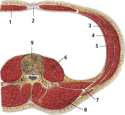 1 – прямая мышца живота; 2 – белая линия живота; 3 – наружная косая мышца живота; 4 – внутренняя косая мышца живота; 5 – поперечная мышца живота; 6 – большая поясничная мышца; 7 – квадратная мышца поясницы; 8 – мышца, выпрямляющая позвоночник; 9 – тело позвонка