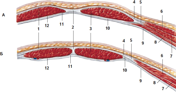 Рис. 64. Схема строения влагалища прямой мышцы живота на протяжении верхних 2/3 мышцы (А) и нижней трети (Б) (поперечный разрез):