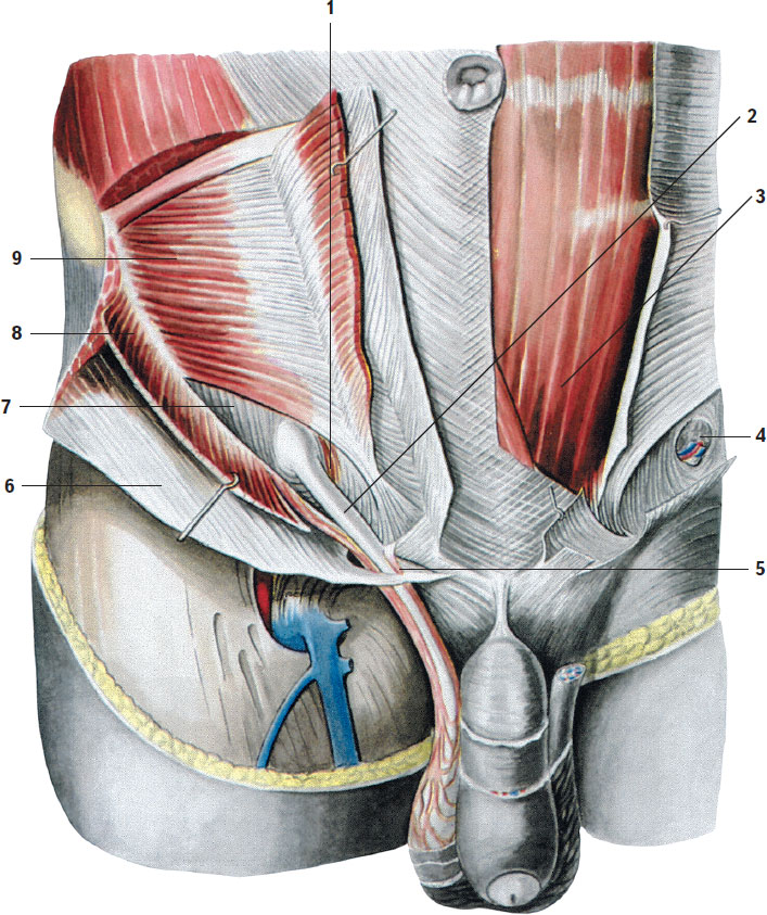 1 – паховый канал (вскрыт); 2 – семенной канатик; 3 – прямая мышца живота; 4 – глубокое кольцо пахового канала; 5 – поверхностное кольцо пахового канала; 6 – апоневроз наружной косой мышцы живота; 7 – поперечная фасция живота; 8 – внутренняя косая мышца живота; 9 – поперечная мышца живота
