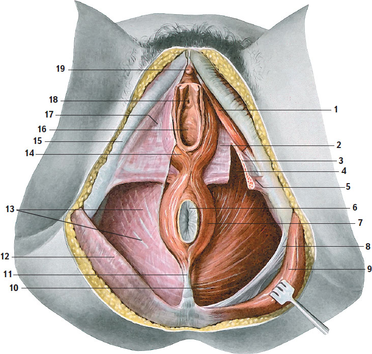 1 – седалищно-пещеристая мышца; 2 – нижняя фасция мочеполовой диафрагмы (мембрана промежности); 3 – глубокая поперечная мышца промежности; 4 – верхняя фасция мочеполовой диафрагмы; 5 – поверхностная поперечная мышца промежности; 6 – задний проход; 7 – наружный сфинктер заднего прохода; 8 – крестцово-бугорная связка; 9 – большая ягодичная мышца; 10 – мышца, поднимающая задний проход; 11 – заднепроходно-копчиковая связка; 12 – ягодичная фасция; 13 – нижняя фасция диафрагмы таза; 14 – луковично-губчатая мышца; 15 – широкая фасция бедра; 16 – отверстие влагалища; 17 – поверхностная фасция промежности; 18 – наружное отверстие мочеиспускательного канала; 19 – головка клитора