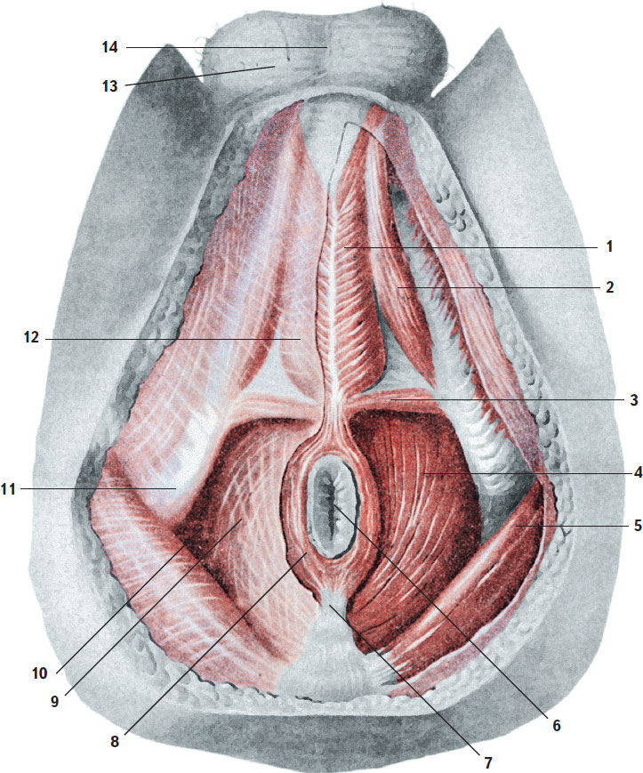 1 – луковично-губчатая мышца; 2 – седалищно-пещеристая мышца; 3 – поверхностная поперечная мышца промежности; 4 – мышца, поднимающая задний проход; 5 – большая ягодичная мышца; 6 – заднепроходное отверстие (анус); 7 – заднепроходно-копчиковая связка; 8 – наружный сфинктер заднего прохода; 9 – нижняя фасция диафрагмы таза; 10 – седалищно-прямокишечная ямка; 11 – седалищный бугор; 12 – поверхностная фасция промежности; 13 – мошонка; 14 – шов мошонки