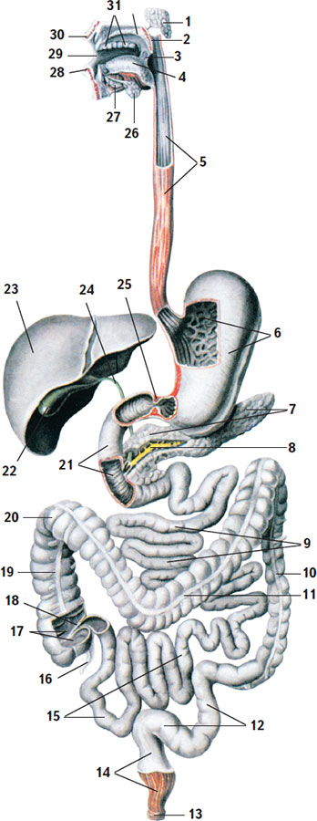 1 – околоушная (слюнная) железа; 2 – мягкое нёбо; 3 – глотка; 4 – язык; 5 – пищевод; 6 – желудок; 7 – поджелудочная железа; 8 – проток поджелудочной железы; 9 – тощая кишка; 10 – нисходящая ободочная кишка; 11 – поперечная ободочная кишка; 12 – сигмовидная ободочная кишка; 13 – наружный сфинктер заднего прохода; 14 – прямая кишка; 15 – подвздошная кишка; 16 – червеобразный отросток (аппендикс); 17 – слепая кишка; 18 – подвздошно-слепокишечный клапан; 19 – восходящая ободочная кишка; 20 – правый (печеночный) изгиб ободочной кишки; 21 – двенадцатиперстная кишка; 22 – желчный пузырь; 23 – печень; 24 – общий желчный проток; 25 – сфинктер привратника желудка; 26 – поднижнечелюстная (слюнная) железа; 27 – подъязычная (слюнная) железа; 28 – нижняя губа; 29 – полость рта; 30 – верхняя губа; 31 – твердое нёбо