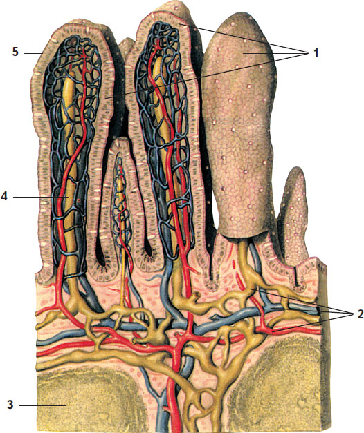 1 – ворсинки; 2 – сеть лимфатических и кровеносных сосудов слизистой оболочки; 3 – одиночный лимфоидный узелок; 4 – центральный лимфатический (млечный) капилляр; 5 – эпителий