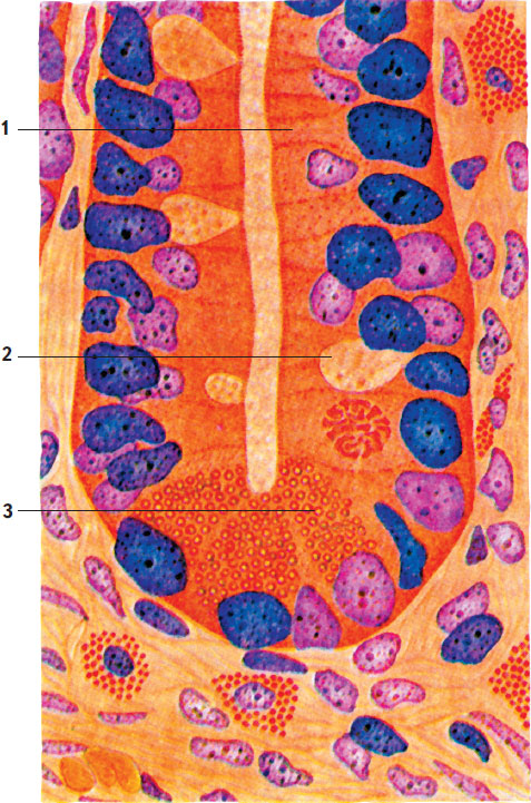 1 – кишечный эпителиоцит с исчерченной каемкой (столбчатая клетка); 2 – бокаловидная клетка; 3 – клетка с ацидофильными гранулами (клетка Панета)