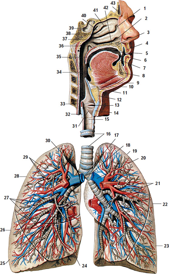 1 – средний носовой ход; 2 – нижний носовой ход; 3 – верхняя челюсть; 4 – верхняя губа; 5 – ротовая полость; 6 – нижняя губа; 7 – язык; 8 – нижняя челюсть; 9 – надгортанник; 10 – подъязычно-надгортанниковая связка; 11 – подъязычная кость; 12 – средняя щитоподъязычная связка; 13 – желудочек гортани; 14 – щитовидный хрящ; 15 – полость гортани; 16 – трахея; 17 – бифуркация трахеи; 18 – главный левый бронх; 19 – верхняя доля левого легкого; 20 – левая легочная артерия; 21 – левые легочные вены; 22 – левое легкое; 23 – нижняя доля левого легкого; 24 – средняя доля правого легкого; 25 – нижняя доля правого легкого; 26 – правое легкое; 27 – долевые и сегментарные бронхи; 28 – верхняя доля правого легкого; 29 – правая легочная артерия; 30 – правый главный бронх; 31 – голосовая складка; 32 – пластинка перстневидного хряща; 33 – складка преддверия; 33 – складка преддверия; 34 – ротовая часть глотки; 35 – мягкое нёбо; 36 – глоточное отверстие слуховой трубы; 37 – нижняя носовая раковина; 38 – средняя носовая раковина; 39 – пазуха клиновидной кости; 40 – верхняя носовая раковина; 41 – верхний носовой ход; 42 – твердое нёбо; 43 – пазуха лобной кости