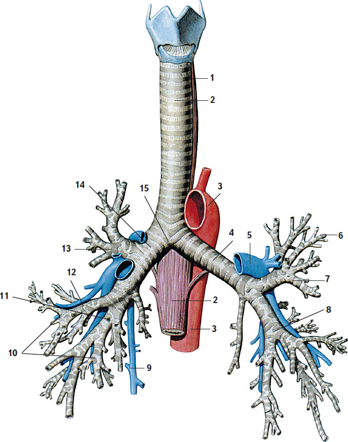 1 – пищевод; 2 – трахея; 3 – аорта; 4 – левый главный бронх; 5 – левая легочная артерия; 6 – левый верхний долевой бронх; 7 – сегментарные бронхи верхней доли левого легкого; 8 – левый нижний долевой бронх; 9 – непарная вена; 10 – сегментарные бронхи нижней и средней долей правого легкого; 11 – правый нижний долевой бронх; 12 – правый средний долевой бронх; 13 – правый верхний долевой бронх; 14 – правый главный бронх; 15 – бифуркация трахеи