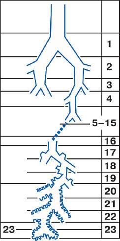 1, 2 – главные бронхи; 3, 4 – долевые и сегментарные бронхи; 5–15 – ветви сегментарных бронхов, дольковый бронх и его разветвления (не показаны); 16 – конечная бронхиола; 17–19 – дыхательные бронхиолы (три порядка ветвлений); 20–22 – альвеолярные ходы (три порядка ветвлений); 23 – альвеолярные мешочки