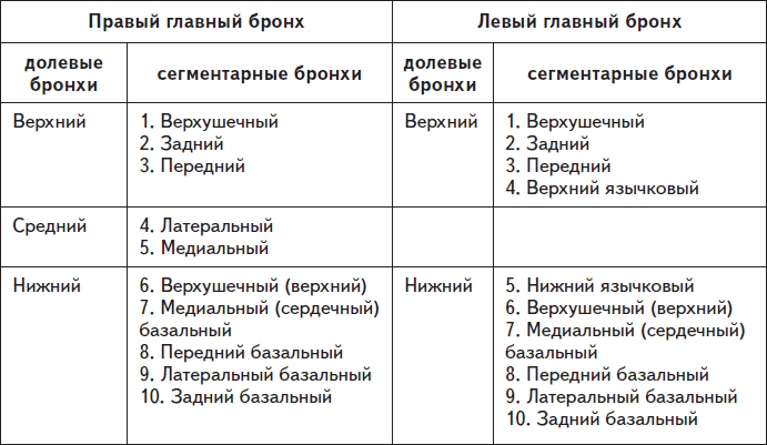 Международная классификация предусматривает определенное название каждого бронхо-легочного сегмента и их нумерацию. Деление бронхов, их название и нумерация представлены в табл. 16.
