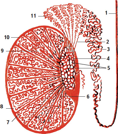 1 – семявыносящий проток; 2 – выносящие канальцы яичка; 3 – проток придатка; 4 – средостение яичка; 5 – сеть яичка; 6 – прямые семенные канальцы; 7–9 – сообщения между семенными канальцами различных долек; 10 – белочная оболочка; 11 – долька придатка яичка