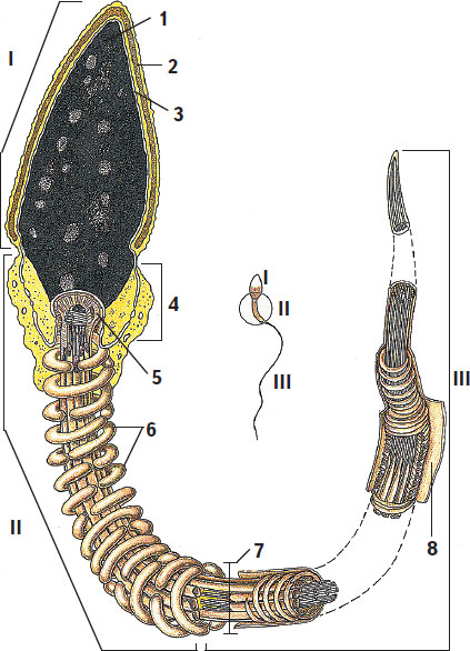 I – головка; II – средняя часть; III – жгутик; 1 – ядро; 2 – акросома; 3 – ядерная оболочка; 4 – шейка; 5 – полосатые столбы; 6 – митохондрии; 7 – аксонема; 8 – цитолемма