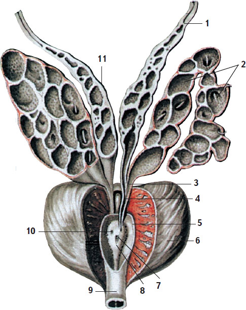 1 – семявыносящий проток; 2 – семенной пузырек; 3 – выделительный проток; 4 – семявыбрасывающий проток; 5 – предстательная часть мочеиспускательного канала; 6 – простата; 7 – предстательная маточка; 8 – семенной холмик; 9 – перепончатая часть мочеиспускательного канала; 10 – устье семявыбрасывающего протока; 11 – ампула семявыносящего протока