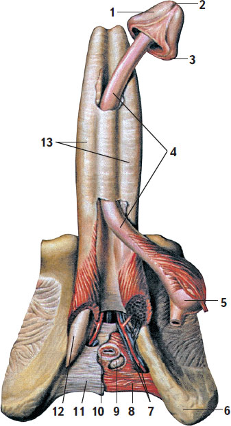 1 – головка полового члена; 2 – наружное отверстие мочеиспускательного канала; 3 – венец головки; 4 – губчатое тело полового члена; 5 – луковица полового члена; 6 – седалищный бугор; 7 – артерия и вена полового члена; 8 – глубокая поперечная мышца; 9 – бульбоуретральная железа; 10 – сфинктер мочеиспускательного канала; 11 – нижняя фасция мочеполовой диафрагмы; 12 – ножка полового члена; 13 – пещеристые тела полового члена (покрыты фасцией)