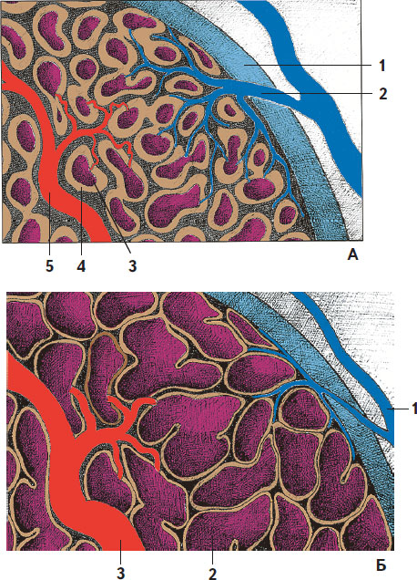 А – неэрегированное состояние: 1 – белочная оболочка; 2 – вена; 3 – синусоиды (каверны, пещеры); 4 – стенка каверны; 5 – завитковая артерия; Б – состояние эрекции: 1 – вена; 2 – синусоиды; 3 – завитковая артерия