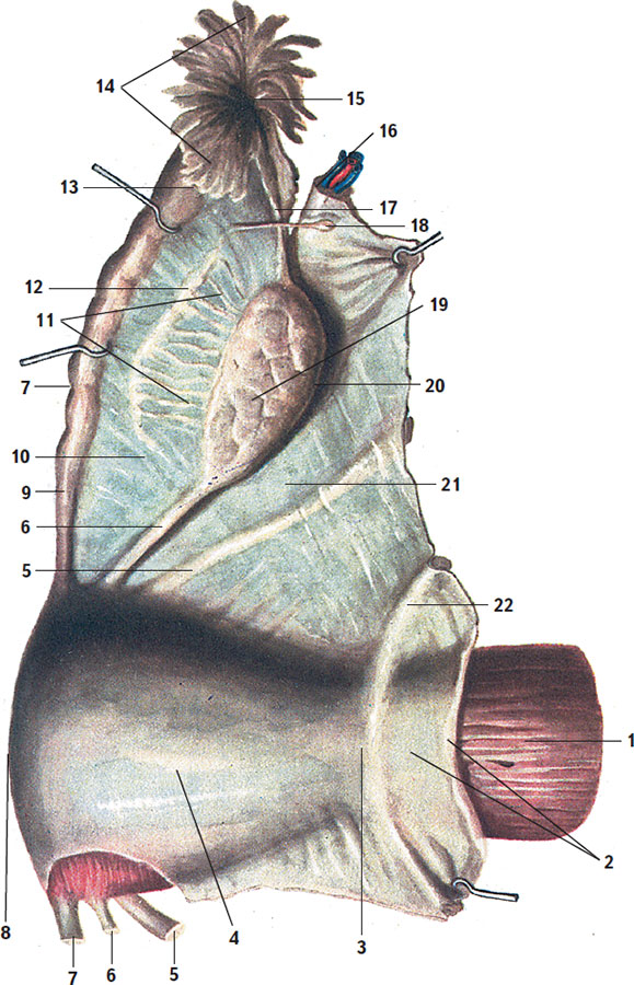 1 – влагалище; 2 – брюшина; 3 – шейка матки; 4 – тело матки; 5 – круглая связка матки; 6 – собственная связка яичника; 7 – маточная труба; 8 – дно матки; 9 – перешеек маточной трубы; 10 – брыжейка маточной трубы; 11 – придаток яичника (поперечные проточки); 12 – продольный проток придатка яичника; 13 – ампула маточной трубы; 14 – бахромки маточной трубы; 15 – брюшное отверстие маточной трубы; 16 – связка, подвешивающая яичник; 17 – яичниковая бахромка; 18 – пузырчатый привесок; 19 – яичник (медиальная поверхность); 20 – свободный край яичника; 21 – широкая связка матки; 22 – прямокишечно-маточная складка