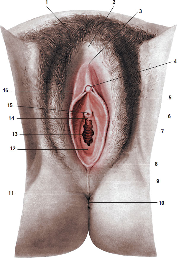 1 – лобок; 2 – передняя спайка половых губ; 3 – крайняя плоть клитора; 4 – головка клитора; 5 – большая половая губа; 6 – малая половая губа; 7 – устье большой железы преддверия (бартолиниевой железы); 8 – уздечка малых половых губ; 9 – задняя спайка половых губ; 10 – задний проход; 11 – промежность; 12 – девственная плева; 13 – отверстие влагалища; 14 – преддверие влагалища; 15 – наружное отверстие мочеиспускательного канала; 16 – уздечка клитора