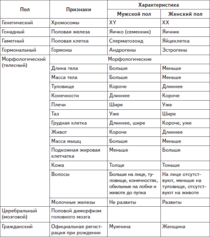 Генетический пол зависит от наличия или отсутствия Y-хромосомы. Напомним: во всех соматических клетках человека имеется по 46 хромосом (диплоидный набор), среди которых 44 соматические и две половые: клетки женского организма имеют две половые Х-хромосомы, мужского одну X и одну Y-хромосому. Половые клетки имеют по одной половой хромосоме: яйцеклетки только X, сперматозоиды X или Y. Именно Y-хромосома, которой обладают только мужчины, направляет в эмбриональном периоде развитие индифферентных половых желез по мужскому пути, превращая их в яички. Генетический пол определяет истинный, или гонадный, пол (греч. gone семя), т. е. пол, обусловленный строением половой железы (яичка или яичника). В свою очередь, истинный пол представляет гаметный пол, т. е. способность желез образовывать сперматозоиды или яйцеклетки, и гормональный пол – способность вырабатывать мужские (андрогены) или женские (эстрогены) половые гормоны. Половые гормоны определяют морфологический пол, т. е. развитие мужских или женских половых органов и вторичных половых признаков. Они же (половые гормоны) определяют мозговой, или церебральный, пол, т. е. половые различия головного мозга. Гражданский пол – это пол, официально зарегистрированный при рождении. Каждый человек ощущает свою половую принадлежность, половую самоидентификацию, идентичность. Гендер (синоним понятия «пол») подчиняется закономерности осознания человеком своей сущности вообще и включает в себя положительное свойство принадлежности к определенной мужской или женской половине человечества и отрицательное свойство исключения из той или иной группы. Гендерная роль – это внешнее проявление и демонстрация поведения, которое позволяет окружающим судить о гендерной идентичности. Иными словами, тендерная роль – это социальное выражение тендерной идентичности. Генетический и гормональный пол определяет биологическую, психологическую и социальную жизнь человека, его половое воспитание, половое самосознание, половое поведение, половую роль и выбор полового партнера.
